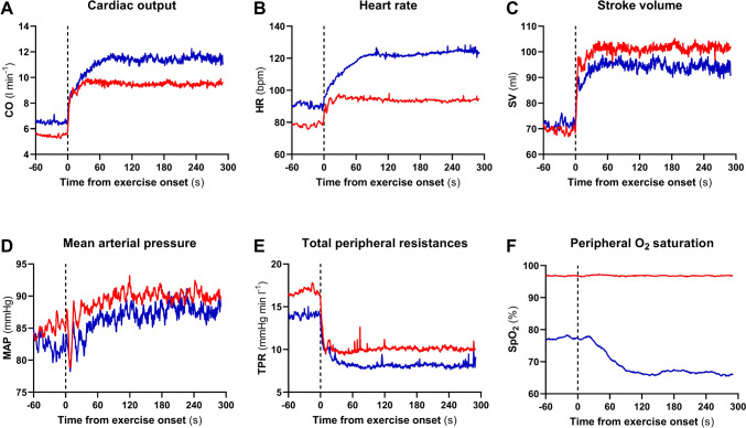 Purpose: We hypothesised that during a rest-to-exercise transient in hypoxia (H), compared to normoxia (N), (i) the initial baroreflex sensitivity (BRS) decrease would be slower and (ii) the fast heart rate (HR) and cardiac output (CO) response would have smaller amplitude (A1) due to lower vagal activity in H than N.