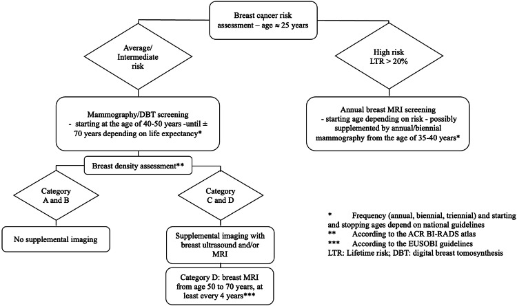 Breast cancer is the most frequently diagnosed cancer in women accounting for about 30% of all new cancer cases and the incidence is constantly increasing. Implementation of mammographic screening has contributed to a reduction in breast cancer mortality of at least 20% over the last 30 years. Screening programs usually include all women irrespective of their risk of developing breast cancer and with age being the only determining factor. This approach has some recognized limitations, including underdiagnosis, false positive cases, and overdiagnosis. Indeed, breast cancer remains a major cause of cancer-related deaths in women undergoing cancer screening. Supplemental imaging modalities, including digital breast tomosynthesis, ultrasound, breast MRI, and, more recently, contrast-enhanced mammography, are available and have already shown potential to further increase the diagnostic performances. Use of breast MRI is recommended in high-risk women and women with extremely dense breasts. Artificial intelligence has also shown promising results to support risk categorization and interval cancer reduction. The implementation of a risk-stratified approach instead of a "one-size-fits-all" approach may help to improve the benefit-to-harm ratio as well as the cost-effectiveness of breast cancer screening. KEY POINTS: Regular mammography should still be considered the mainstay of the breast cancer screening. High-risk women and women with extremely dense breast tissue should use MRI for supplemental screening or US if MRI is not available. Women need to participate actively in the decision to undergo personalized screening. KEY RECOMMENDATIONS: Mammography is an effective imaging tool to diagnose breast cancer in an early stage and to reduce breast cancer mortality (evidence level I). Until more evidence is available to move to a personalized approach, regular mammography should be considered the mainstay of the breast cancer screening. High-risk women should start screening earlier; first with yearly breast MRI which can be supplemented by yearly or biennial mammography starting at 35-40 years old (evidence level I). Breast MRI screening should be also offered to women with extremely dense breasts (evidence level I). If MRI is not available, ultrasound can be performed as an alternative, although the added value of supplemental ultrasound regarding cancer detection remains limited. Individual screening recommendations should be made through a shared decision-making process between women and physicians.