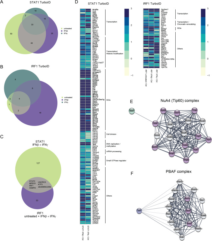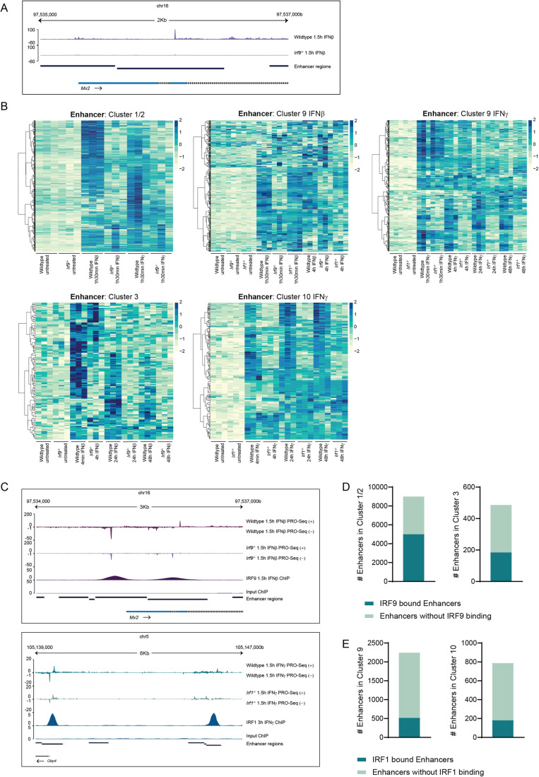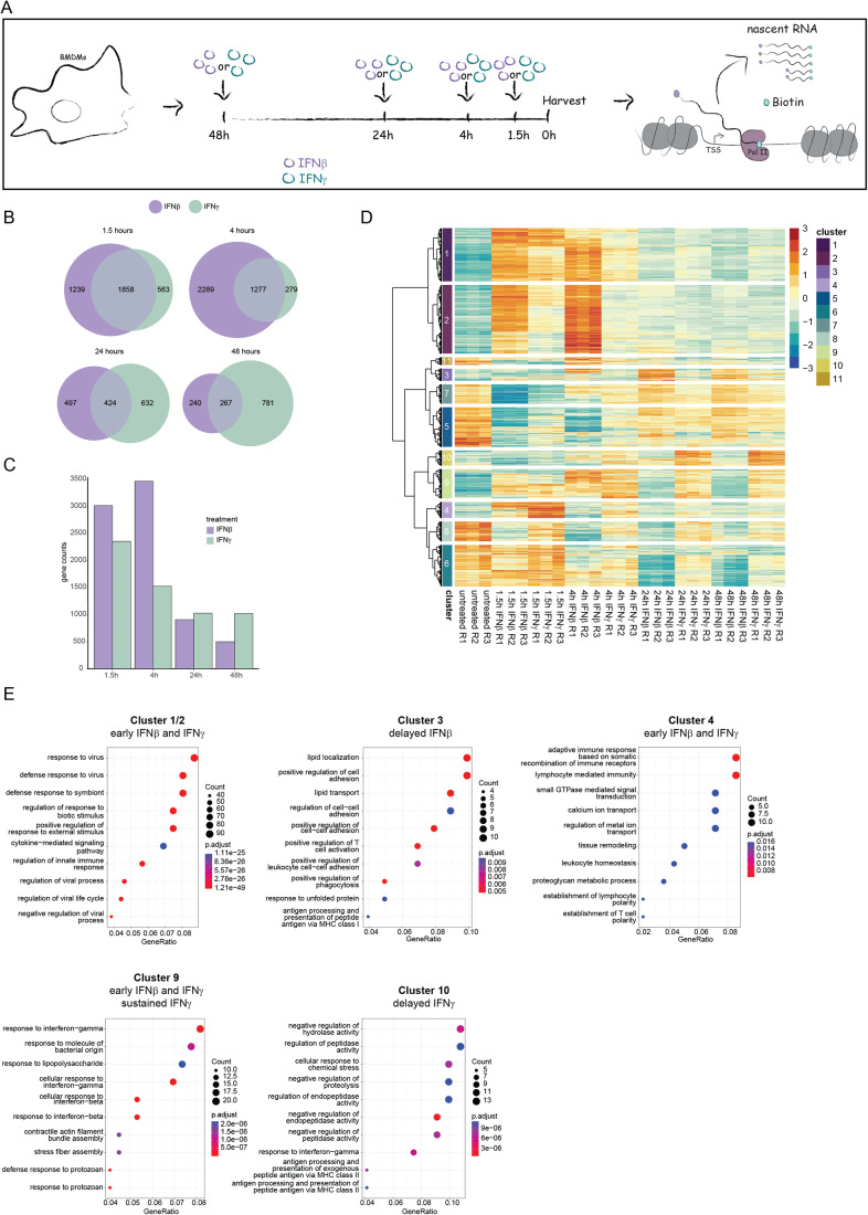 Type I interferons (IFN-I, including IFNβ) and IFNγ produce overlapping, yet clearly distinct immunological activities. Recent data show that the distinctness of global transcriptional responses to the two IFN types is not apparent when comparing their immediate effects. By analyzing nascent transcripts induced by IFN-I or IFNγ over a period of 48 h, we now show that the distinctiveness of the transcriptomes emerges over time and is based on differential employment of the ISGF3 complex as well as of the second-tier transcription factor IRF1. The distinct transcriptional properties of ISGF3 and IRF1 correspond with a largely diverse nuclear protein interactome. Mechanistically, we describe the specific input of ISGF3 and IRF1 into enhancer activation and the regulation of chromatin accessibility at interferon-stimulated genes (ISG). We further report differences between the IFN types in altering RNA polymerase II pausing at ISG 5' ends. Our data provide insight how transcriptional regulators create immunological identities of IFN-I and IFNγ.