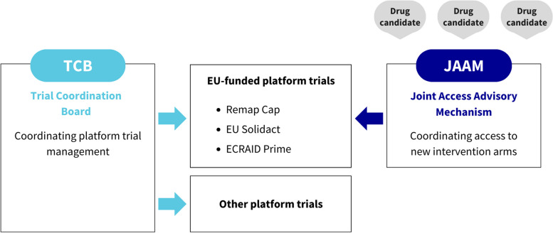 To ensure optimal coordination of the EU-funded COVID-19 platform trials, a double coordination mechanism was established. It included the Trial Coordination Board (TCB) to promote the dialogue between investigators and relevant public health stakeholders and the Joint Access Advisory Mechanism (JAAM) to streamline access of new intervention arms to the platform trials. Both the TCB and the JAAM emerged as efficient instruments to promote cooperation and optimise the use of resources within EU-funded adaptive platform trials. In addition, an adaptive platform trial toolbox was developed to collect information and literature on challenges and solutions identified to date. The recently funded 'Coordination MEchanism for Cohorts and Trials' (CoMeCT) project will endeavour to make this model sustainable, with a further expansion to other emerging infectious diseases, as part of the governance of the current and future platform trials for pandemic preparedness. This example could serve as a model for platform trial coordination in other disease areas.