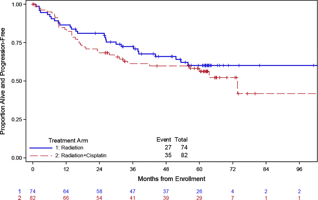 Materials and methods: Between February 2008 and August 2020, 165 patients were randomly assigned 1:1 to receive either radiation treatment alone or a combination of chemotherapy and radiation treatment. The primary objective of this study was to determine whether chemoradiation therapy was more effective than radiation therapy alone at improving PFS.
