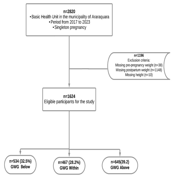 Study design: A prospective cohort study with 1642 pregnant women selected from 2017 to 2023, with gestational age ≤ 18 weeks and followed until delivery in the city of Araraquara, Southeast Brazil. The relationship between IOM-recommended GWG and fetal outcomes (abdominal subcutaneous tissue thickness, arm and thigh subcutaneous tissue area and intrauterine growth restriction) and neonatal outcomes (percentage of fat mass, fat-free mass, birth weight and length, ponderal index, weight adequateness for gestational age by the Intergrowth curve, prematurity, and Apgar score) were investigated. Generalized Estimating Equations were used.