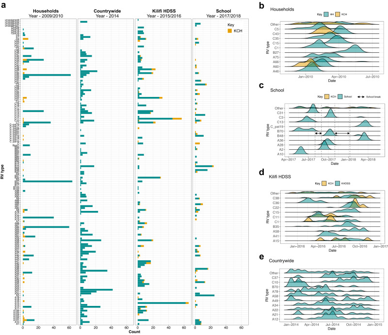 Rhinoviruses (RV), common human respiratory viruses, exhibit significant antigenic diversity, yet their dynamics across distinct social structures remain poorly understood. Our study delves into RV dynamics within Kenya by analysing VP4/2 sequences across four different social structures: households, a public primary school, outpatient clinics in the Kilifi Health and Demographics Surveillance System (HDSS), and countrywide hospital admissions and outpatients. The study revealed the greatest diversity of RV infections at the countrywide level (114 types), followed by the Kilifi HDSS (78 types), the school (47 types), and households (40 types), cumulatively representing >90% of all known RV types. Notably, RV diversity correlated directly with the size of the population under observation, and several RV type variants occasionally fuelled RV infection waves. Our findings highlight the critical role of social structures in shaping RV dynamics, information that can be leveraged to enhance public health strategies. Future research should incorporate whole-genome analysis to understand fine-scale evolution across various social structures.