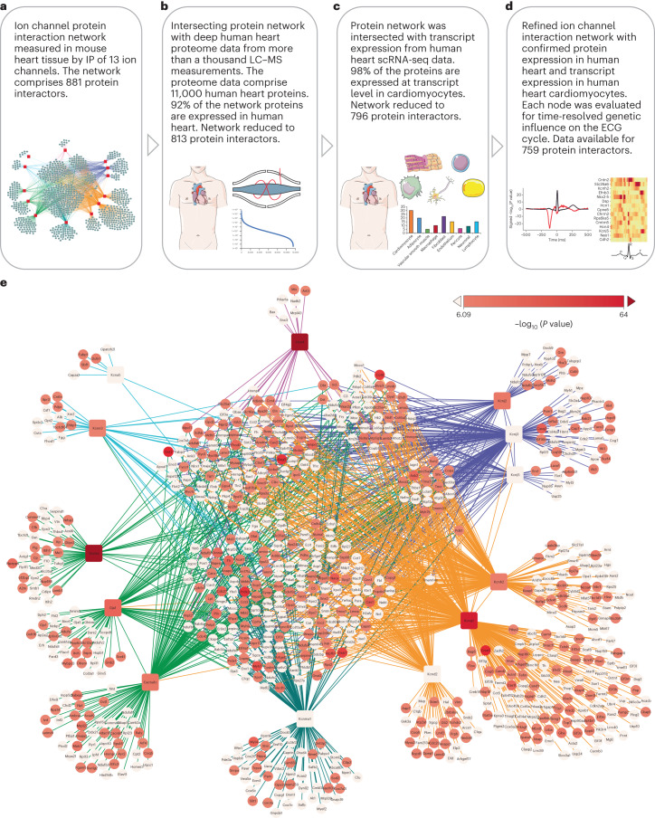 Protein-protein interactions are essential for normal cellular processes and signaling events. Defining these interaction networks is therefore crucial for understanding complex cellular functions and interpretation of disease-associated gene variants. We need to build a comprehensive picture of the interactions, their affinities and interdependencies in the specific organ to decipher hitherto poorly understood signaling mechanisms through ion channels. Here we report the experimental identification of the ensemble of protein interactors for 13 types of ion channels in murine cardiac tissue. Of these, we validated the functional importance of ten interactors on cardiac electrophysiology through genetic knockouts in zebrafish, gene silencing in mice, super-resolution microscopy and patch clamp experiments. Furthermore, we establish a computational framework to reconstruct human cardiomyocyte ion channel networks from deep proteome mapping of human heart tissue and human heart single-cell gene expression data. Finally, we integrate the ion channel interactome with human population genetics data to identify proteins that influence the electrocardiogram (ECG). We demonstrate that the combined channel network is enriched for proteins influencing the ECG, with 44% of the network proteins significantly associated with an ECG phenotype. Altogether, we define interactomes of 13 major cardiac ion channels, contextualize their relevance to human electrophysiology and validate functional roles of ten interactors, including two regulators of the sodium current (epsin-2 and gelsolin). Overall, our data provide a roadmap for our understanding of the molecular machinery that regulates cardiac electrophysiology.