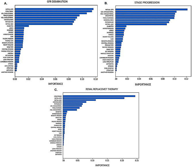 Results: Three prediction models were developed-Model 1 (risk at 4.5 years, n = 1446) with a F1 of 0.82, 0.53, and 0.55 for RRT, stage progression, and reduction in the eGFR, respectively,- Model 2 (time- to-event, n = 2143) with a C-index of 0.89, 0.67, and 0.67 for RRT, stage progression, reduction in the eGFR, respectively, and Model 3 (reduced Model 2) with C-index = 0.68, 0.68 and 0.88, for RRT, stage progression, reduction in the eGFR, respectively.
