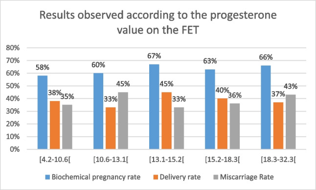 Results: Five-hundred thirty-five FET cycles were analyzed, of which 136 (25.4%) underwent treatment with DYD. There were 337 pregnancies (63%), 207 live births (38.6%), and 130 miscarriages (38.5%). The P4 values could be modeled by a gamma distribution, with a mean of 14.5 ng/ml and a standard deviation of 1.95 ng/ml. The variables female age on the day of FET, ethnicity, and weight were associated with a variation in the serum P4 values. There were no differences in the results between cycles with or without the indication for DYD supplementation.