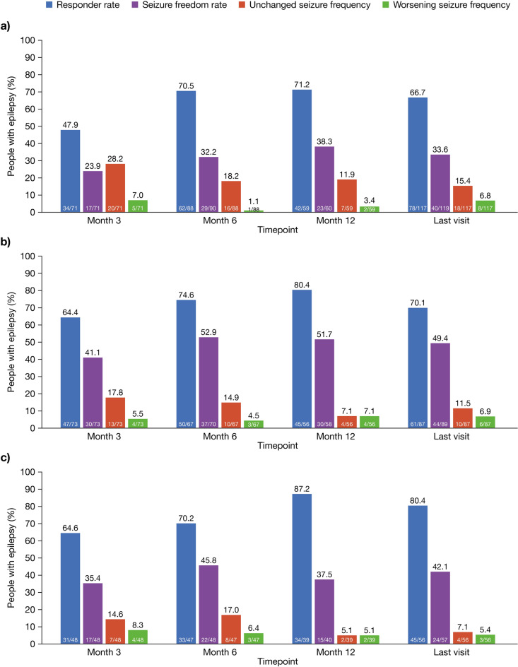 Methods: A post hoc analysis was conducted of PERMIT Extension data from individuals with a known aetiology. Retention was assessed after 3, 6 and 12 months. Effectiveness was assessed after 3, 6 and 12 months and at the last visit (last observation carried forward). Effectiveness assessments included responder rate (≥ 50% seizure frequency reduction) and seizure freedom rate (no seizures since at least the prior visit). Safety/tolerability was assessed by evaluating adverse events (AEs) and AEs leading to discontinuation.