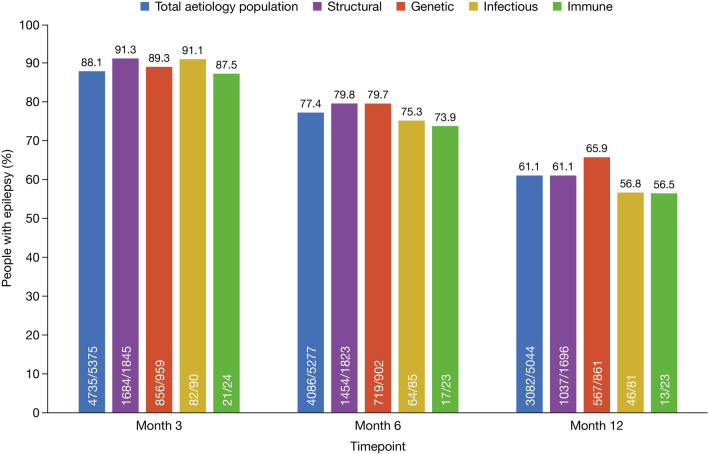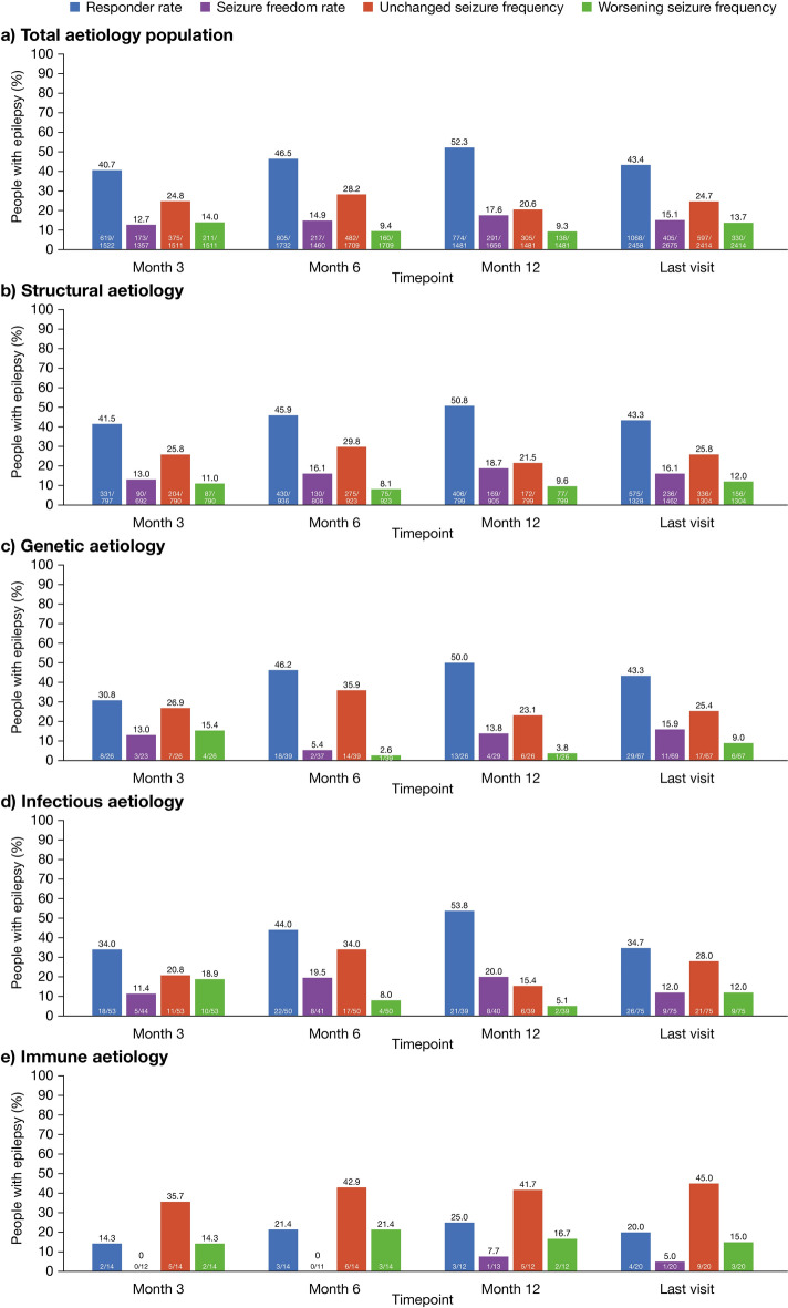 Results: PERMIT Extension included 1945 individuals with structural aetiology, 1012 with genetic aetiology, 93 with an infectious aetiology, and 26 with an immune aetiology. Retention rates at 12 months were 61.1% (structural), 65.9% (genetic), 56.8% (infectious) and 56.5% (immune). At the last visit, responder rates (total seizures) were 43.3% (structural), 68.3% (genetic), 37.0% (infectious) and 20.0% (immune), and corresponding seizure freedom rates were 15.8%, 46.5%, 11.1% and 5.0%, respectively. AE incidence rates were 58.0% (structural), 46.5% (genetic), 51.1% (infectious) and 65.0% (immune), and corresponding rates of discontinuation due to AEs over 12 months were 18.9%, 16.4%, 18.5% and 21.7%, respectively. The types of AEs reported were generally consistent across aetiology subgroups, with no idiosyncratic AEs emerging.