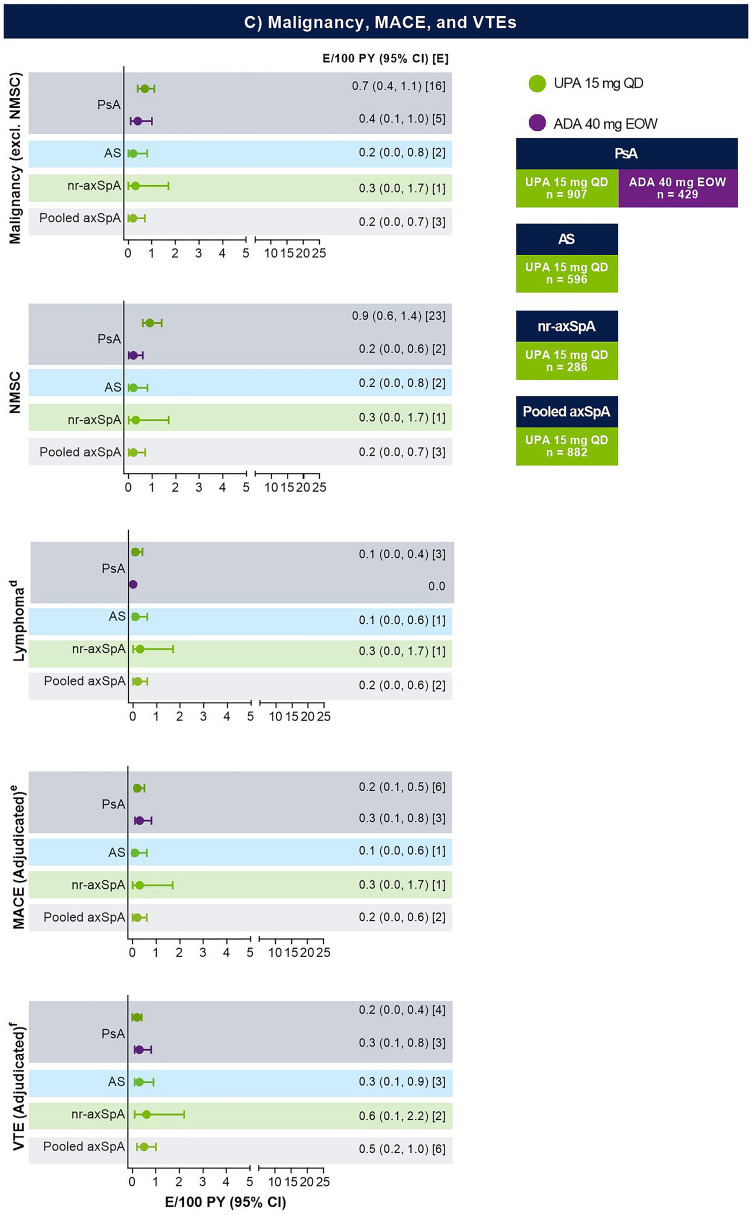 Results: A total of 1789 patients (PsA, n = 907; AS, n = 596; nr-axSpA, n = 286) received ≥ 1 dose of upadacitinib 15 mg for 3689 PY of exposure or adalimumab (n = 429) for 1147 PY of exposure. Overall TEAEs and serious TEAEs were highest in PsA and numerically higher with upadacitinib versus adalimumab; rates were similar between AS and nr-axSpA. In PsA, higher rates of serious infection, herpes zoster (HZ), lymphopenia, and nonmelanoma skin cancer (NMSC) were observed with upadacitinib versus adalimumab. Rates of malignancy excluding NMSC, adjudicated major adverse cardiovascular events, and adjudicated venous thromboembolic events were comparable between upadacitinib and adalimumab in PsA and were similar across diseases.