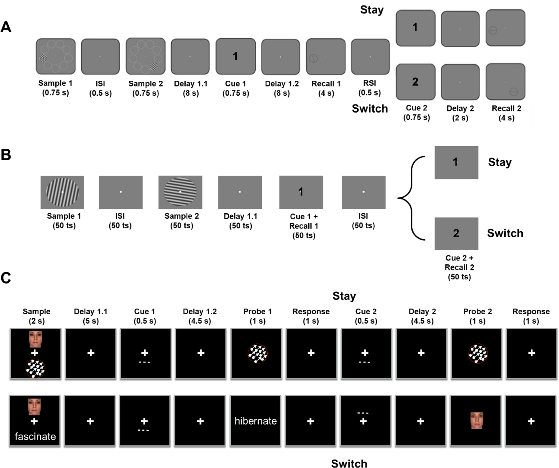 The ability to prioritize among contents in working memory (WM) is critical for successful control of thought and behavior. Recent work has demonstrated that prioritization in WM can be implemented by representing different states of priority in different representational formats. Here, we explored the mechanisms underlying WM prioritization by simulating the double serial retrocuing task with recurrent neural networks. Visualization of stimulus representational dynamics using principal component analysis revealed that the network represented trial context (order of presentation) and priority via different mechanisms. Ordinal context, a stable property lasting the duration of the trial, was accomplished by segregating representations into orthogonal subspaces. Priority, which changed multiple times during a trial, was accomplished by separating representations into different strata within each subspace. We assessed the generality of these mechanisms by applying dimensionality reduction and multiclass decoding to fMRI and EEG data sets and found that priority and context are represented differently along the dorsal visual stream and that behavioral performance is sensitive to trial-by-trial variability of priority coding, but not context coding.