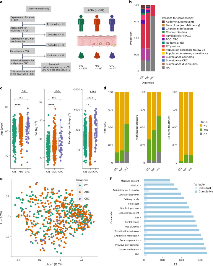 Despite substantial progress in cancer microbiome research, recognized confounders and advances in absolute microbiome quantification remain underused; this raises concerns regarding potential spurious associations. Here we study the fecal microbiota of 589 patients at different colorectal cancer (CRC) stages and compare observations with up to 15 published studies (4,439 patients and controls total). Using quantitative microbiome profiling based on 16S ribosomal RNA amplicon sequencing, combined with rigorous confounder control, we identified transit time, fecal calprotectin (intestinal inflammation) and body mass index as primary microbial covariates, superseding variance explained by CRC diagnostic groups. Well-established microbiome CRC targets, such as Fusobacterium nucleatum, did not significantly associate with CRC diagnostic groups (healthy, adenoma and carcinoma) when controlling for these covariates. In contrast, the associations of Anaerococcus vaginalis, Dialister pneumosintes, Parvimonas micra, Peptostreptococcus anaerobius, Porphyromonas asaccharolytica and Prevotella intermedia remained robust, highlighting their future target potential. Finally, control individuals (age 22-80 years, mean 57.7 years, standard deviation 11.3) meeting criteria for colonoscopy (for example, through a positive fecal immunochemical test) but without colonic lesions are enriched for the dysbiotic Bacteroides2 enterotype, emphasizing uncertainties in defining healthy controls in cancer microbiome research. Together, these results indicate the importance of quantitative microbiome profiling and covariate control for biomarker identification in CRC microbiome studies.
