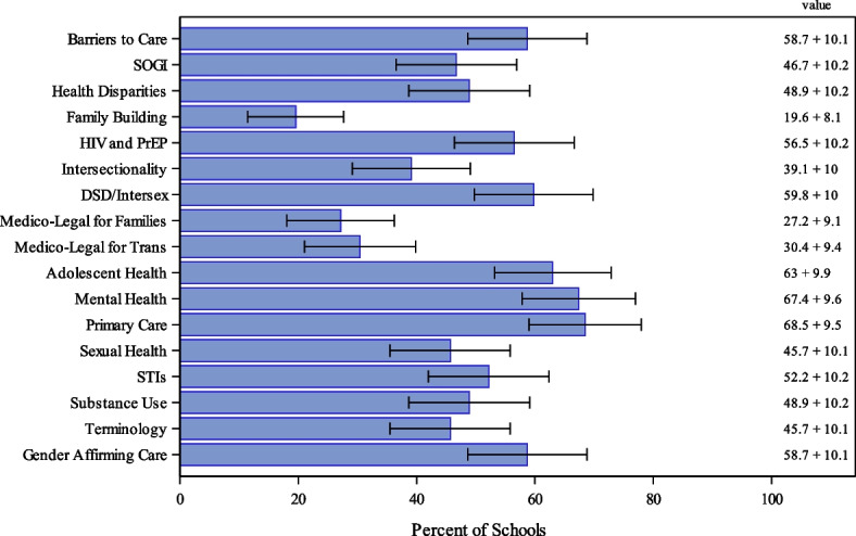 Results: Of 214 schools, 100 (46.7%) responded, of which 85 (85.0%) fully completed the questionnaire. Compared to 5 median hours dedicated to LGBTQI + health-related in a 2011 study, the 2022 median reported time was 11 h (interquartile range [IQR], 6-16 h, p < 0.0001). Two UME institutions (2.4%; 95% CI, 0.0%-5.8%) reported 0 h during the pre-clerkship phase; 21 institutions (24.7%; CI, 15.5%-33.9%) reported 0 h during the clerkship phase; and 1 institution (1.2%; CI, 0%-3.5%) reported 0 h across the curriculum. Median US allopathic clerkship hours were significantly different from US osteopathic clerkship hours (4 h [IQR, 1-6 h] versus 0 h [IQR, 0-0 h]; p = 0.01). Suggested strategies to increase content included more curricular material focusing on LGBTQI + health and health disparities at 55 schools (64.7%; CI, 54.6%-74.9%), more faculty willing and able to teach LGBTQI + -related content at 49 schools (57.7%; CI, 47.1%-68.2%), and more evidence-based research on LGBTQI + health and health disparities at 24 schools (28.2%; CI, 18.7%-37.8%).