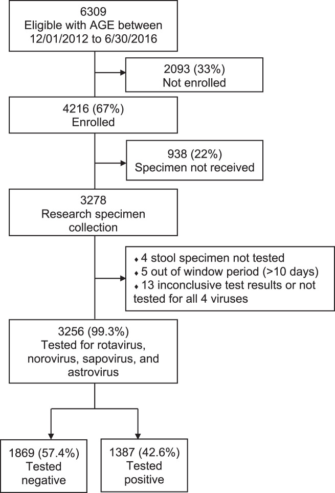 Methods: From December 1, 2012 to June 30, 2016, AGE surveillance was performed for children between 15 days and 17 years old in the emergency, inpatient, and outpatient settings at Vanderbilt's Monroe Carell Jr. Children's Hospital in Nashville, TN. Stool specimens were tested for norovirus, sapovirus, rotavirus, and astrovirus. We compared demographic and clinical characteristics, along with the MVS and CS, by viral detection status and by setting.