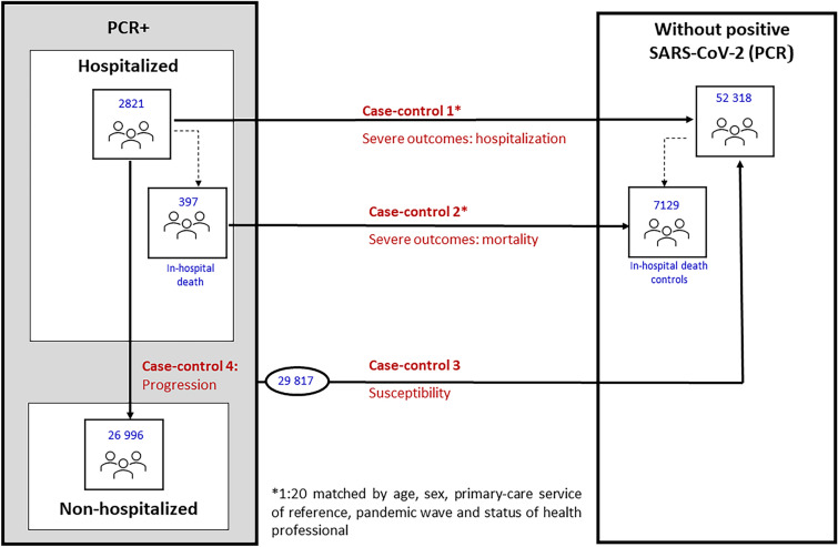 Methods: We conducted a population-based case - control study, involving 4 substudies: (i) Hospitalisation; (ii) Mortality, using subjects hospitalised with a PCR + as cases and subjects without a PCR + as controls; (iii) Progression, including subjects with a PCR + (hospitalised versus non-hospitalised); and (iv) Susceptibility, with all subjects with a PCR + and subjects without a PCR + . Adjusted odds ratios (ORa) and their 95% confidence intervals (95% CI) were calculated.