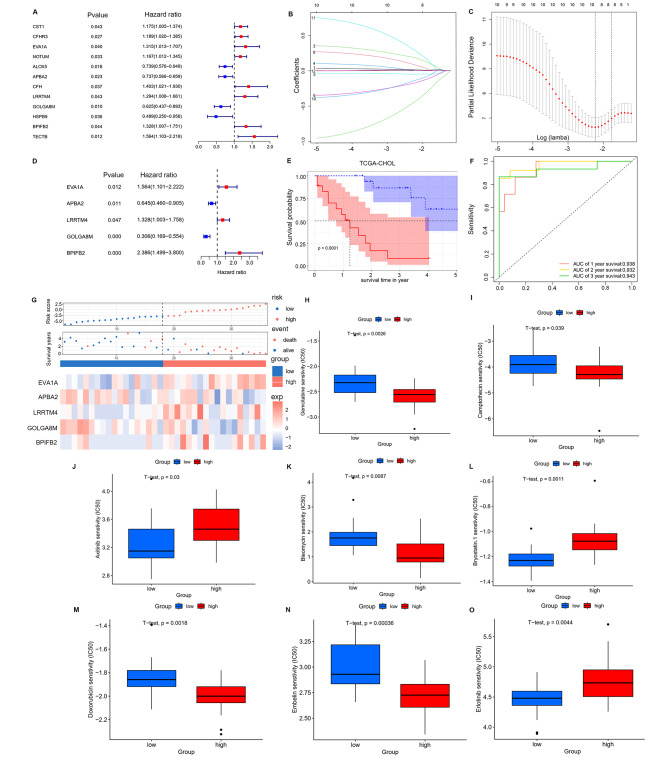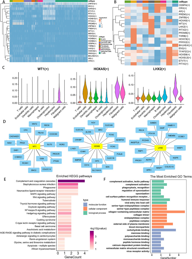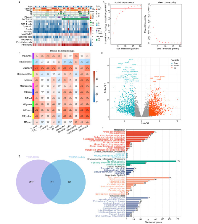Results: Through the intersection of TCGA DEGs and WGCNA module genes, 784 differential genes related to CAFs infiltration were obtained. After a series of regression analyses, the CAFs score was generated by integrating the expressions of EVA1A, APBA2, LRRTM4, GOLGA8M, BPIFB2, and their corresponding coefficients. In the TCGA-CHOL, GSE89748, and 107,943 cohorts, the high CAFs score group showed unfavorable survival prognosis (p < 0.001, p = 0.0074, p = 0.028, respectively). Additionally, a series of drugs have been predicted to be more sensitive to the high-risk group (p < 0.05). Subsequent to dimension reduction and clustering, thirteen clusters were identified to construct the single-cell atlas. Cell-cell interaction analysis unveiled significant enhancement of signal transduction in tumor tissues, particularly from fibroblasts to malignant cells via diverse pathways. Moreover, SCENIC analysis indicated that HOXA5, WT1, and LHX2 are fibroblast specific motifs.