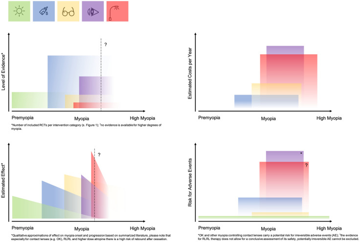 Results: From the initial 3224 retrieved records, 18 reviews and 41 original articles reporting results from RCTs were included. While there is more evidence supporting the efficacy of low-dose atropine and certain myopia-controlling contact lenses in slowing myopia progression, the evidence about the efficacy of the newer interventions, such as spectacle lenses (e.g., defocus incorporated multiple segments and highly aspheric lenslets) is more limited. Behavioral interventions, i.e., increased outdoor time, seem effective for preventing the onset of myopia if implemented successfully in schools and homes. While environmental interventions and spectacles are regarded as generally safe, pharmacological interventions, contact lenses, and RLRL may be associated with adverse effects. All interventions, except for behavioral change, are tied to moderate to high expenditures.