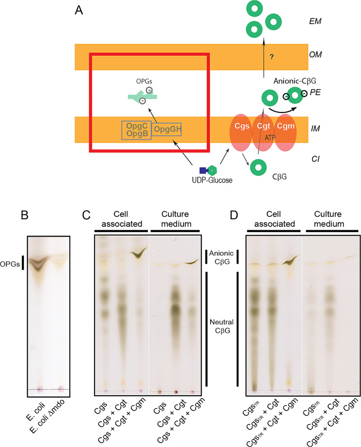 Results: We present the production of CβG in specially designed E. coli strains by means of the deletion of intrinsic polysaccharide biosynthetic genes and the heterologous expression of enzymes involved in CβG synthesis, transport and succinilation. These strains produce different types of CβG: unsubstituted CβG, anionic CβG and CβG of high size. Unsubstituted CβG with a degree of polymerization of 17 to 24 glucoses were produced and secreted to the culture medium by one of the strains. Through high cell density culture (HCDC) of that strain we were able to produce 4,5 g of pure unsubstituted CβG /L in culture medium within 48 h culture.