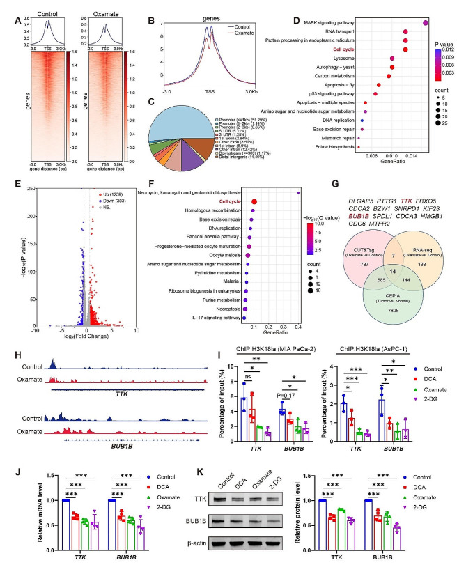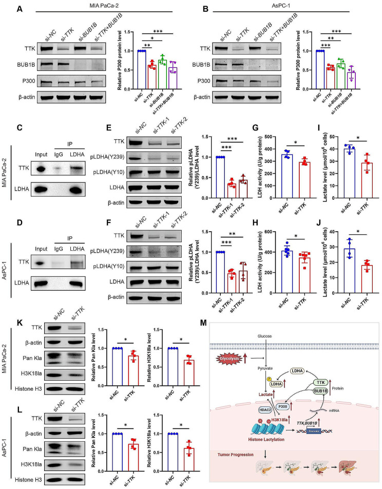 Methods: The level of histone lactylation in PDAC was identified by western blot and immunohistochemistry, and its relationship with the overall survival was evaluated using a Kaplan-Meier survival plot. The participation of histone lactylation in the growth and progression of PDAC was confirmed through inhibition of histone lactylation by glycolysis inhibitors or lactate dehydrogenase A (LDHA) knockdown both in vitro and in vivo. The potential writers and erasers of histone lactylation in PDAC were identified by western blot and functional experiments. The potential target genes of H3K18 lactylation (H3K18la) were screened by CUT&Tag and RNA-seq analyses. The candidate target genes TTK protein kinase (TTK) and BUB1 mitotic checkpoint serine/threonine kinase B (BUB1B) were validated through ChIP-qPCR, RT-qPCR and western blot analyses. Next, the effects of these two genes in PDAC were confirmed by knockdown or overexpression. The interaction between TTK and LDHA was identified by Co-IP assay.