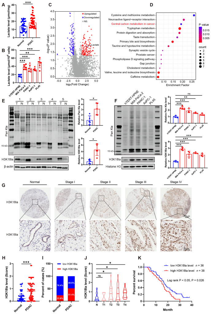 Background: Metabolic reprogramming and epigenetic alterations contribute to the aggressiveness of pancreatic ductal adenocarcinoma (PDAC). Lactate-dependent histone modification is a new type of histone mark, which links glycolysis metabolite to the epigenetic process of lactylation. However, the role of histone lactylation in PDAC remains unclear.