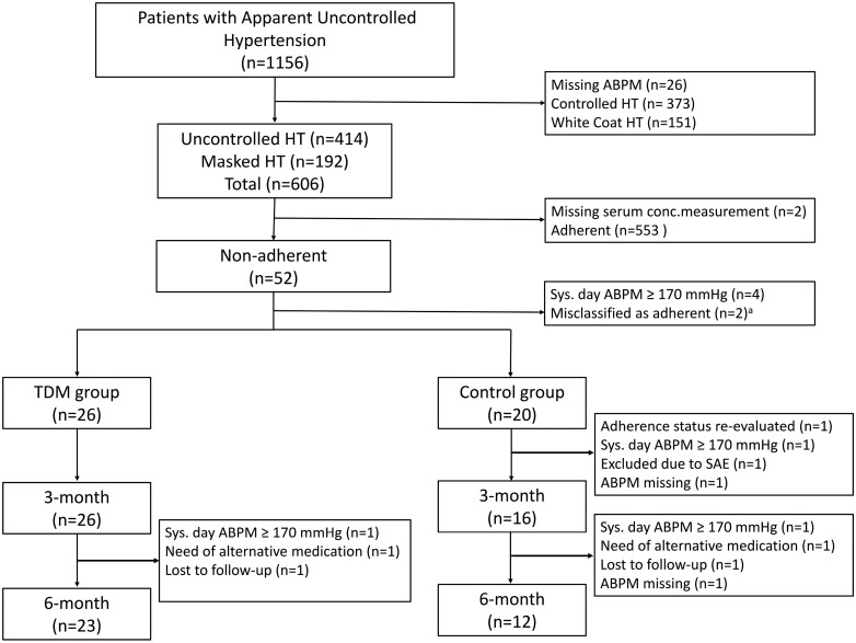 Results: From 2017 to 2022, we randomized 46 diagnosed nonadherent from a total of 606 patients with uncontrolled HT. The TDM group had a 6.7 (±14.5) mm Hg reduction from 147.9 (±10.3) to 141.1 (±14.1) mm Hg, and the control group experienced a 7.3 (±13.2) mm Hg reduction from 147.1 (±9.2) to 139.1 (±17.4) mm Hg, P = 0.9 between groups. Adherence improved in both groups, 73% in the TDM group and 59% in the control group became adherent at 3 months, P = 0.51.