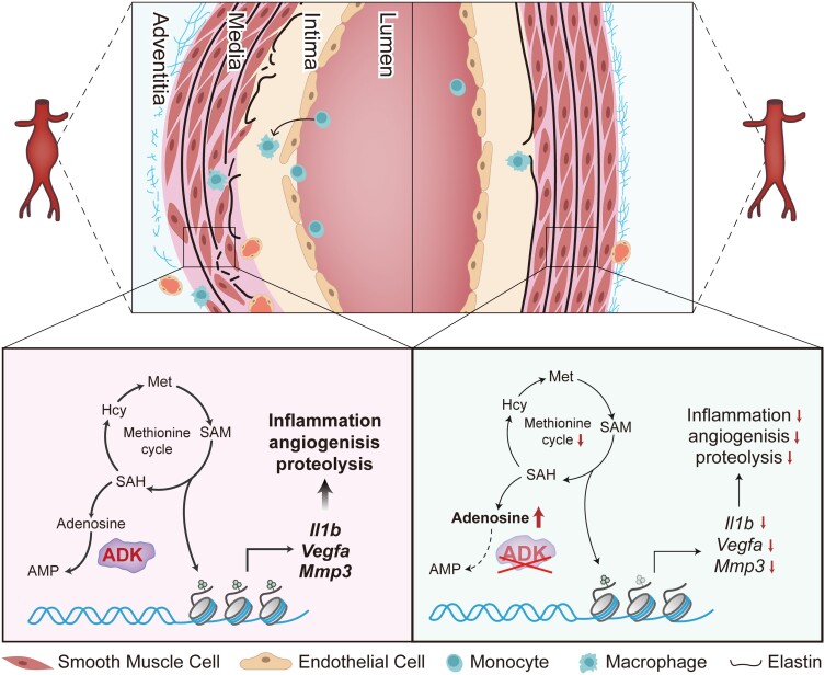 Methods and results: We used a combination of genetic and pharmacological approaches in murine models of AAA induced by calcium chloride (CaCl2) application or angiotensin II (Ang II) infusion to study the role of ADK in the development of AAA. In vitro functional assays were performed by knocking down ADK with adenovirus-short hairpin RNA in human vascular smooth muscle cells (VSMCs), and the molecular mechanisms underlying ADK function were investigated using RNA-sequencing, isotope tracing, and chromatin immunoprecipitation quantitative polymerase chain reaction (ChIP-qPCR). The heterozygous deficiency of ADK protected mice from CaCl2- and Ang II-induced AAA formation. Moreover, specific knockout of ADK in VSMCs prevented Ang II-induced AAA formation, as evidenced by reduced aortic extracellular elastin fragmentation, neovascularization, and aortic inflammation. Mechanistically, ADK knockdown in VSMCs markedly suppressed the expression of inflammatory genes associated with AAA formation, and these effects were independent of adenosine receptors. The metabolic flux and ChIP-qPCR results showed that ADK knockdown in VSMCs decreased S-adenosylmethionine (SAM)-dependent transmethylation, thereby reducing H3K4me3 binding to the promoter regions of the genes that are associated with inflammation, angiogenesis, and extracellular elastin fragmentation. Furthermore, the ADK inhibitor ABT702 protected mice from CaCl2-induced aortic inflammation, extracellular elastin fragmentation, and AAA formation.