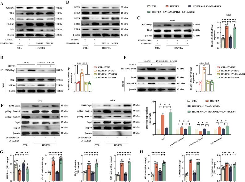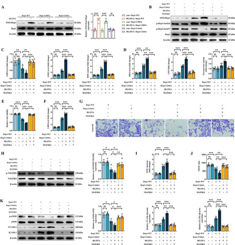 Dynamin-related protein 1 (Drp1) is a crucial regulator of mitochondrial dynamics, the overactivation of which can lead to cardiovascular disease. Multiple distinct posttranscriptional modifications of Drp1 have been reported, among which S-nitrosylation was recently introduced. However, the detailed regulatory mechanism of S-nitrosylation of Drp1 (SNO-Drp1) in cardiac microvascular dysfunction in diabetes remains elusive. The present study revealed that mitogen-activated protein kinase kinase kinase kinase 4 (MAP4K4) was consistently upregulated in diabetic cardiomyopathy (DCM) and promoted SNO-Drp1 in cardiac microvascular endothelial cells (CMECs), which in turn led to mitochondrial dysfunction and cardiac microvascular disorder. Further studies confirmed that MAP4K4 promoted SNO-Drp1 at human C644 (mouse C650) by inhibiting glutathione peroxidase 4 (GPX4) expression, through which MAP4K4 stimulated endothelial ferroptosis in diabetes. In contrast, inhibition of MAP4K4 via DMX-5804 significantly reduced endothelial ferroptosis, alleviated cardiac microvascular dysfunction and improved cardiac dysfunction in db/db mice by reducing SNO-Drp1. In parallel, the C650A mutation in mice abolished SNO-Drp1 and the role of Drp1 in promoting cardiac microvascular disorder and cardiac dysfunction. In conclusion, our findings demonstrate that MAP4K4 plays an important role in endothelial dysfunction in DCM and reveal that SNO-Drp1 and ferroptosis activation may act as downstream targets, representing potential therapeutic targets for DCM.