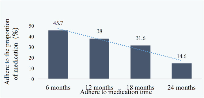 This study aimed to investigate the real-world standardisation and adherence of medical treatment regimens in patients with chronic obstructive pulmonary disease (COPD) in the community for making future management strategy. The follow-up data and treatment information of patients with COPD, which were collected through the Management Information Center of COPD (MICCOPD) in 21 community health service centres in Songjiang District, a countryside region of Shanghai. Concordance between the pharmaceutical treatment plan and recommendation of 2017 Global Initiative for Chronic Obstructive Lung Disease (GOLD) report during the follow-up management period, as well as the medication adherence by patients,were analysed. Out of the 2044 patients diagnosed with COPD, 814 patients (39.8%) who had an initial record of medication use were found to meet the inclusion criteria. The most common medication regimens were long-acting beta-agonist plus inhaled corticosteroids (35.9%) and oral bronchodilators (41.9%). Among these 814 patients, 45.7%, 38.0%, 31.6% and 14.6% adhered to the treatment after 6, 12, 18 and 24 months of follow-up, respectively. The concordance rate with the regimens recommended by the 2017 GOLD guidelines was 35.5% at baseline, 35.5% at 6 months, 32.7% at 12 months, 35.4% at 18 months and 37% at 24 months. The compliance and guideline consistency rates of patients with COPD in the community under the management of general practitioners need to be improved. Enhancing general practitioner proficiency in the prevention and management of COPD and increasing patient awareness of the condition, are crucial standardising and improving adherence to initial and follow-up COPD treatments.