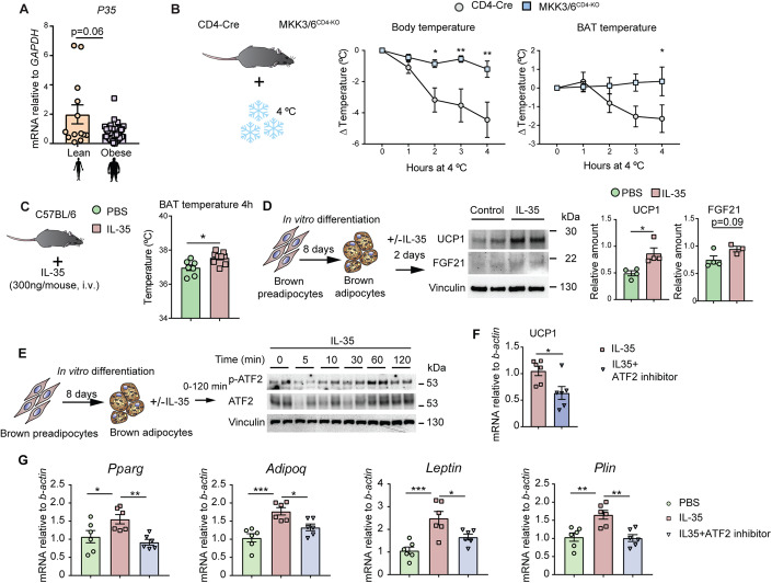Obesity is characterized by low-grade inflammation, energy imbalance and impaired thermogenesis. The role of regulatory T cells (Treg) in inflammation-mediated maladaptive thermogenesis is not well established. Here, we find that the p38 pathway is a key regulator of T cell-mediated adipose tissue (AT) inflammation and browning. Mice with T cells specifically lacking the p38 activators MKK3/6 are protected against diet-induced obesity, leading to an improved metabolic profile, increased browning, and enhanced thermogenesis. We identify IL-35 as a driver of adipocyte thermogenic program through the ATF2/UCP1/FGF21 pathway. IL-35 limits CD8+ T cell infiltration and inflammation in AT. Interestingly, we find that IL-35 levels are reduced in visceral fat from obese patients. Mechanistically, we demonstrate that p38 controls the expression of IL-35 in human and mouse Treg cells through mTOR pathway activation. Our findings highlight p38 signaling as a molecular orchestrator of AT T cell accumulation and function.