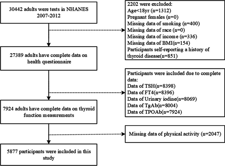 Methods: Using data from the National Health and Nutrition Examination Survey (NHANES) 2007-2012, we included 5877 participants and analyzed the associations of thyroid function with weekly physical activity (PAM, expressed in metabolic equivalents of task) and physical activity time (PAT) in American adults. Univariate and multivariate logistic analyses were used to demonstrate the associations of PAM and PAT with the primary outcome. Linear regression analysis was performed to determine the associations between thyroid biochemical indicators/diseases and PAM/PAT.