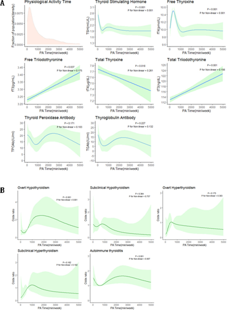 Results: Our study revealed noticeable sex differences in daily PA among the participants. The odds ratio of the fourth versus the first quartile of PAM was 3.07 (confidence interval, CI [1.24, 7.58], p = 0.02) for overt hypothyroidism, 3.25 (CI [1.12, 9.45], p = 0.03) for subclinical hyperthyroidism in adult men. PAT in the range of 633-1520 min/week was found to be associated with the occurrence of subclinical hyperthyroidism [p < 0.001, OR (95% CI) = 5.89 (1.85, 18.80)], PAT of the range of > 1520 min/week was found to be associated with the occurrence of overt hypothyroidism [p < 0.001, OR (95% CI) = 8.70 (2.80, 27.07)] and autoimmune thyroiditis (AIT) [p = 0.03, OR (95% CI) = 1.42 (1.03, 1.97)] in adult men. When PAM < 5000 MET*minutes/week or PAT < 1000 min/week, RCS showed an L-shaped curve for TSH and an inverted U-shaped curve for FT4. The changes in FT3 and TT3 in men were linearly positively correlated with PAM and PAT, while TT4 is linearly negatively correlated.