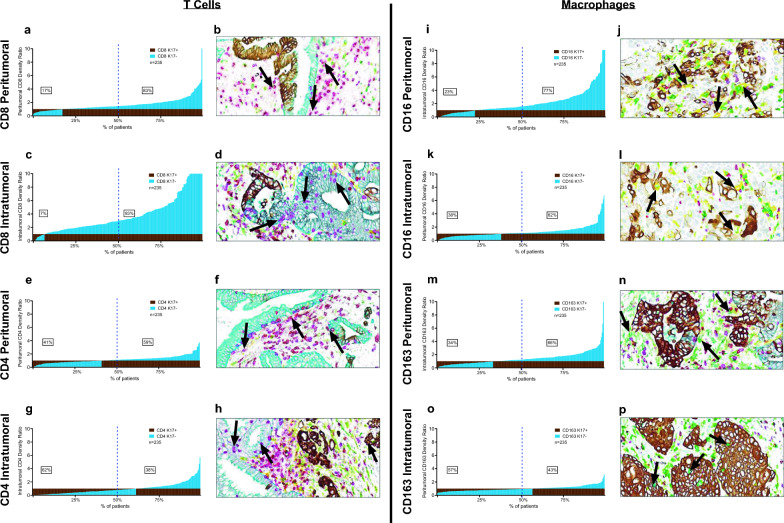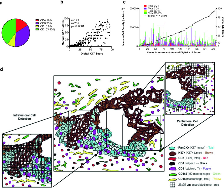 Methods: Multiplex immunohistochemistry (mIHC) and automated image analysis based on novel computational imaging technology were used to decipher the abundance and spatial distribution of T cells, macrophages, and tumor cells, relative to K17 expression in 235 PDACs.