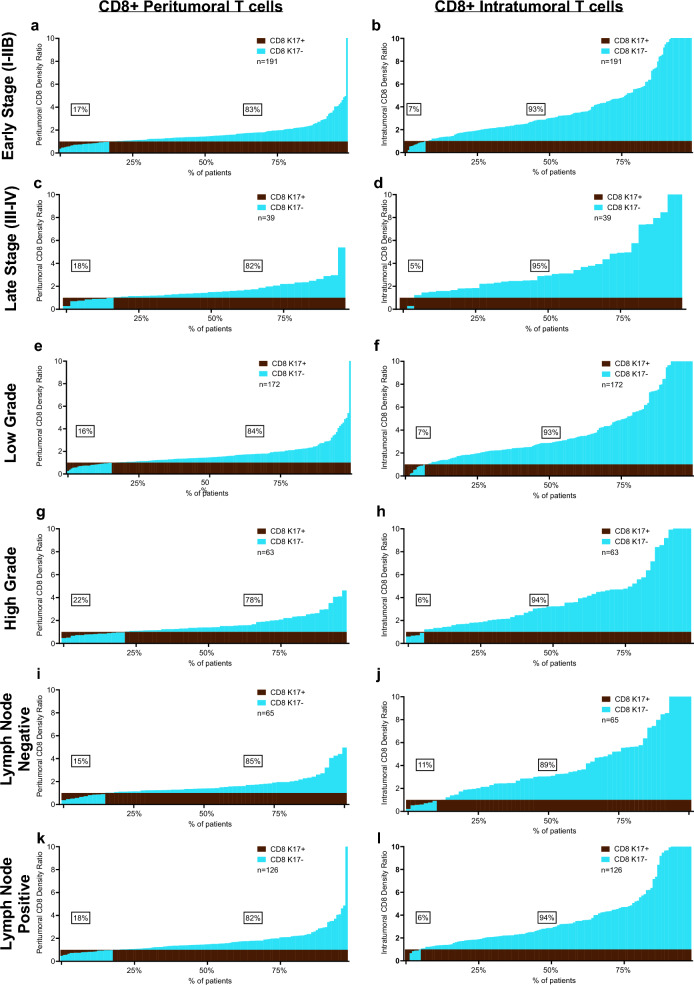 Results: K17 expression had profound effects on the exclusion of intratumoral CD8+ T cells and was also associated with decreased numbers of peritumoral CD8+ T cells, CD16+ macrophages, and CD163+ macrophages (p < 0.0001). The differences in the intratumor and peritumoral CD8+ T cell abundance were not impacted by neoadjuvant therapy, tumor stage, grade, lymph node status, histologic subtype, nor KRAS, p53, SMAD4, or CDKN2A mutations.