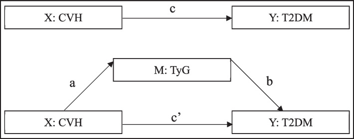 Results: The prevalence of abnormal glucose metabolism in this group was 26.7% (n = 529), among which the prevalence of impaired fasting glucose (IFG) was 9.5% (male vs. female: 8.7% vs 10.1%, P = 0.338), and the prevalence of type 2 diabetes mellitus (T2DM) was 19.0% (male vs. female: 17.8 vs. 19.8%, P = 0.256). The ideal CVH rate (number of ideal CVH metrics ≥ 5) was only 21.0%. The risk of IFG and T2DM decreased by 23% and 20% with each increase in one ideal CVH metrics, with OR (95%CI) of 0.77(0.65-0.92) and 0.80(0.71-0.90), respectively (P -trend < 0.001). TyG fully mediated the ideal CVH and the incidence of T2DM, and its mediating effect OR (95%CI) was 0.88(0.84-0.91).