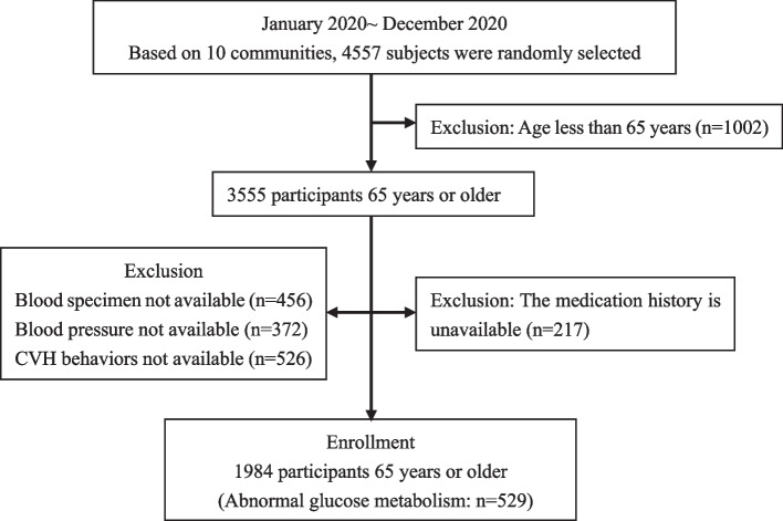 Background: Limited information is available on the effect of ideal cardiovascular health (CVH) and abnormal glucose metabolism in elderly people. We aimed to analyze the prevalence of CVH behaviors, abnormal glucose metabolism, and their correlation in 65 and older people.