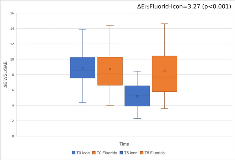 Results: Images of 116 teeth from 36 patients were analyzed. The ΔE for the "Icon" treated WSL was smaller (T1ICON = 5.0 ± 1.4) than in the fluoride group (T1Fluoride = 8.4 ± 3.2). Caries infiltration significantly improved the aesthetic appearance of WSL (p < 0.001), which remained satisfactory at six months (T5ICON = 5.2 ± 1.6).