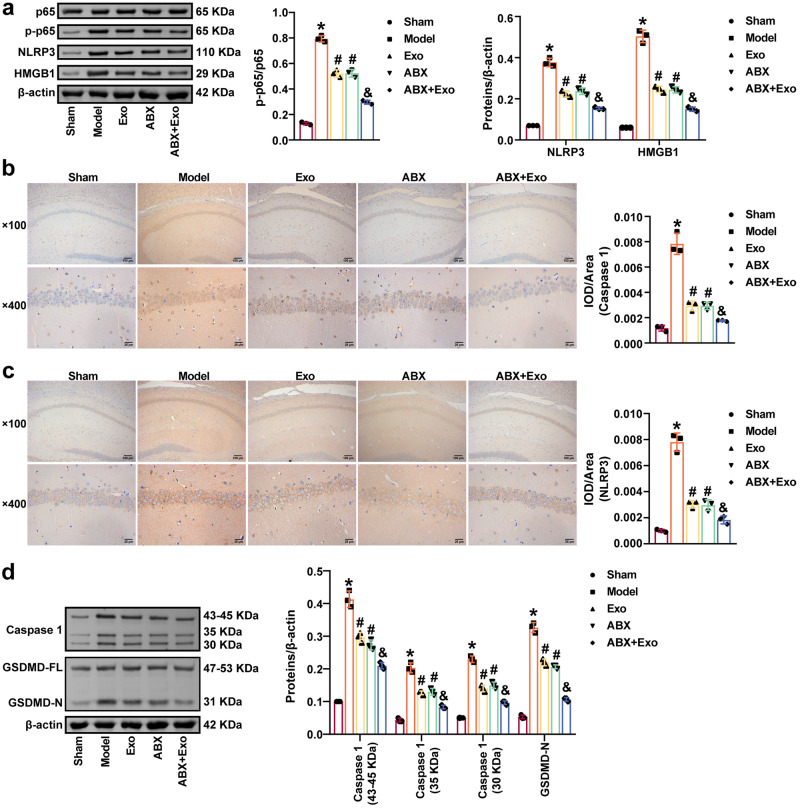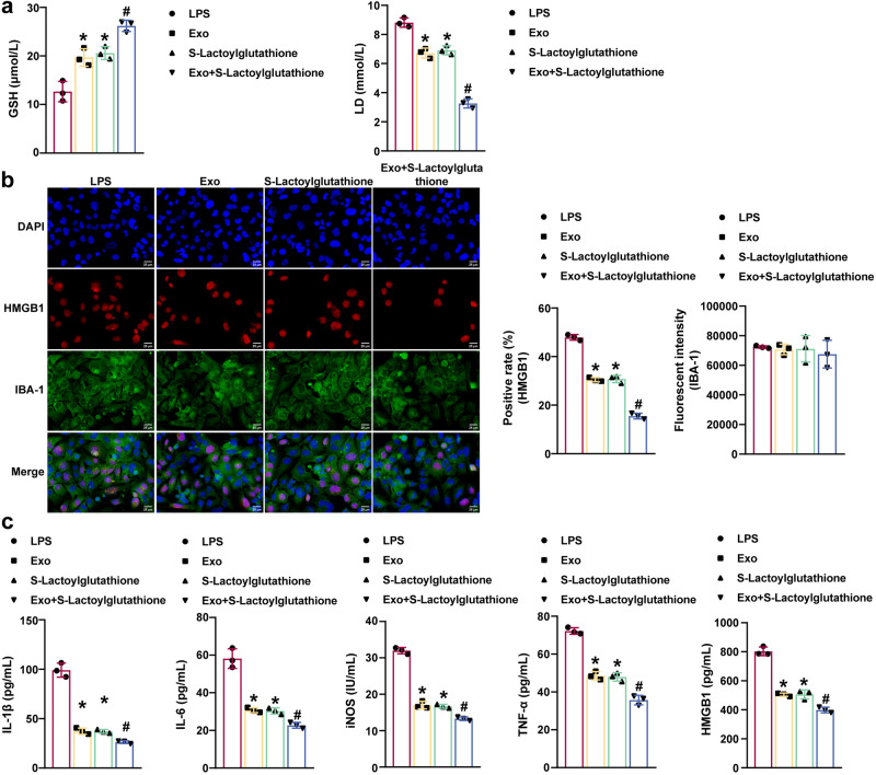 MiRNAs in mesenchymal stem cells (MSCs)-derived exosome (MSCs-exo) play an important role in the treatment of sepsis. We explored the mechanism through which MSCs-exo influences cognitive impairment in sepsis-associated encephalopathy (SAE). Here, we show that miR-140-3p targeted Hmgb1. MSCs-exo plus miR-140-3p mimic (Exo) and antibiotic imipenem/cilastatin (ABX) improve survival, weight, and cognitive impairment in cecal ligation and puncture (CLP) mice. Exo and ABX inhibit high mobility group box 1 (HMGB1), IBA-1, interleukin (IL)-1β, IL-6, iNOS, TNF-α, p65/p-p65, NLRP3, Caspase 1, and GSDMD-N levels. In addition, Exo upregulates S-lactoylglutathione levels in the hippocampus of CLP mice. Our data further demonstrates that Exo and S-lactoylglutathione increase GSH levels in LPS-induced HMC3 cells and decrease LD and GLO2 levels, inhibiting inflammatory responses and pyroptosis. These findings suggest that MSCs-exo-mediated delivery of miR-140-3p ameliorates cognitive impairment in mice with SAE by HMGB1 and S-lactoylglutathione metabolism, providing potential therapeutic targets for the clinical treatment of SAE.