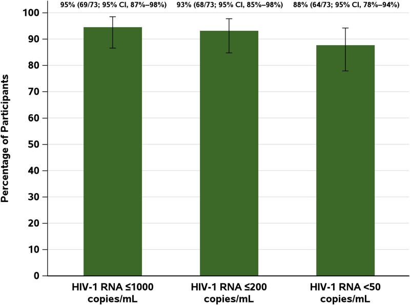 Results: We enrolled 91 participants with TB/HIV: 75 (82%) ART-naive participants starting TLD after a median 15 days on TB treatment, 10 (11%) ART-naive participants starting TLD and TB treatment, 5 (5%) starting TB treatment after a median 3.3 years on TLD, and 1 (1%) starting TB treatment and TLD after changing from efavirenz-lamivudine-tenofovir. Median age was 37 years, 35% were female, the median CD4 count was 120 cells/mm3 (interquartile range, 50-295), and 87% had HIV-1 RNA >1000 copies/mL. Among 89 surviving participants, 80 were followed to TB treatment completion, including 7 who had no HIV-1 RNA result due to missed visits. The primary virologic outcome was assessed in 73 participants, 69 of whom (95%; 95% confidence interval, 89%-100%) had HIV-1 RNA ≤1000 copies/mL. No dolutegravir resistance mutations were detected among 4 participants with HIV-1 RNA >1000 copies/mL.