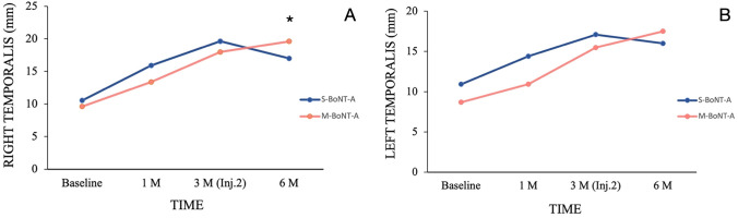 Methods: The present randomized triple-blinded clinical trial enrolled 26 female participants aged between 25 and 50 years complaining about masseter hypertrophy. Participants received 75U of BoNT-A (abobotulinumtoxinA) in both masseter muscles and after three months were randomized to receive a second treatment session of saline solution (S-BoNT-A) or BoNT-A (M-BoNT-A). Longitudinal assessments included temporalis muscle thickness through ultrasound, EMG activity, subjective pain, and masseter prominence severity after one, three, and six months of the first injection session. Muscle thickness, EMG, and subjective pain were analysed using two-way ANOVA with repeated measures and post hoc Sidak test, and for masseter prominence severity, Friedman and Mann-Whitney tests were used.