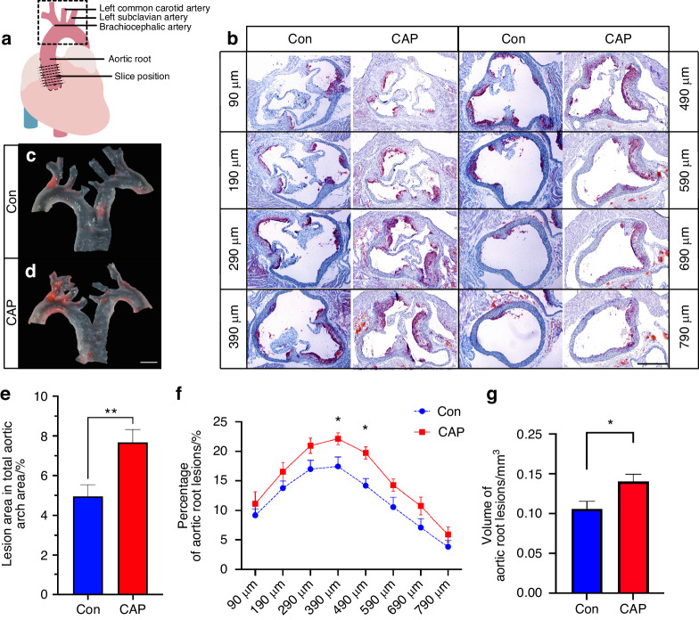 The aim of this study was to explore the impact of chronic apical periodontitis (CAP) on atherosclerosis in apoE-/- mice fed high-fat diet (HFD). This investigation focused on the gut microbiota, metabolites, and intestinal barrier function to uncover potential links between oral health and cardiovascular disease (CVD). In this study, CAP was shown to exacerbate atherosclerosis in HFD-fed apoE-/- mice, as evidenced by the increase in plaque size and volume in the aortic walls observed via Oil Red O staining. 16S rRNA sequencing revealed significant alterations in the gut microbiota, with harmful bacterial species thriving while beneficial species declining. Metabolomic profiling indicated disruptions in lipid metabolism and primary bile acid synthesis, leading to elevated levels of taurochenodeoxycholic acid (TCDCA), taurocholic acid (TCA), and tauroursodeoxycholic acid (TDCA). These metabolic shifts may contribute to atherosclerosis development. Furthermore, impaired intestinal barrier function, characterized by reduced mucin expression and disrupted tight junction proteins, was observed. The increased intestinal permeability observed was positively correlated with the severity of atherosclerotic lesions, highlighting the importance of the intestinal barrier in cardiovascular health. In conclusion, this research underscores the intricate interplay among oral health, gut microbiota composition, metabolite profiles, and CVD incidence. These findings emphasize the importance of maintaining good oral hygiene as a potential preventive measure against cardiovascular issues, as well as the need for further investigations into the intricate mechanisms linking oral health, gut microbiota, and metabolic pathways in CVD development.