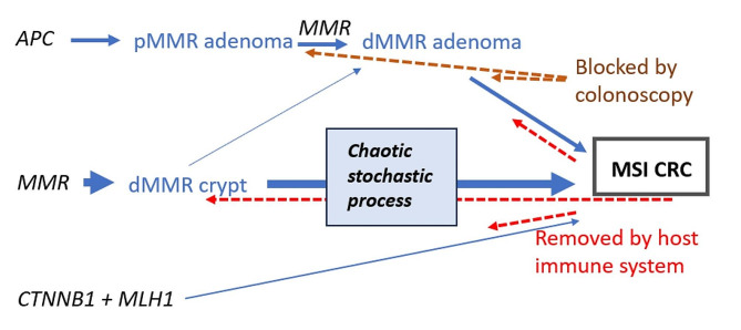 Conclusions: Colonoscopy prevented CRC in path_PMS2 carriers but not in the others. Our findings are consistent with colonoscopy surveillance blocking the adenoma-carcinoma pathway by removing identified adenomas which might otherwise become CRCs. However, in the other carriers most CRCs likely arised from dMMR cells in the crypts that have an increased mutation rate with increased stochastic chaotic probabilities for mutations. Therefore, this mechanism, that may be associated with no or only a short sojourn time of MSI tumours as adenomas, could explain the findings in our previous and current reports.