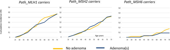 Results: Most of the path_MMR carriers in each genetic group had no adenomas. There was no association between incidences of CRC and the presence of adenomas. There was no CRC observed in path_PMS2 carriers.