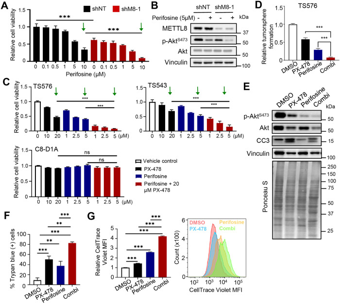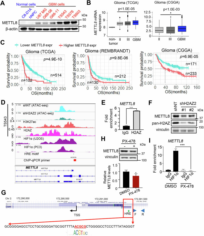 Epitranscriptomic RNA modifications are crucial for the maintenance of glioma stem cells (GSCs), the most malignant cells in glioblastoma (GBM). 3-methylcytosine (m3C) is a new epitranscriptomic mark on RNAs and METTL8 represents an m3C writer that is dysregulated in cancer. Although METTL8 has an established function in mitochondrial tRNA (mt-tRNA) m3C modification, alternative splicing of METTL8 can also generate isoforms that localize to the nucleolus where they may regulate R-loop formation. The molecular basis for METTL8 dysregulation in GBM, and which METTL8 isoform(s) may influence GBM cell fate and malignancy remain elusive. Here, we investigated the role of METTL8 in regulating GBM stemness and tumorigenicity. In GSC, METTL8 is exclusively localized to the mitochondrial matrix where it installs m3C on mt-tRNAThr/Ser(UCN) for mitochondrial translation and respiration. High expression of METTL8 in GBM is attributed to histone variant H2AZ-mediated chromatin accessibility of HIF1α and portends inferior glioma patient outcome. METTL8 depletion impairs the ability of GSC to self-renew and differentiate, thus retarding tumor growth in an intracranial GBM xenograft model. Interestingly, METTL8 depletion decreases protein levels of HIF1α, which serves as a transcription factor for several receptor tyrosine kinase (RTK) genes, in GSC. Accordingly, METTL8 loss inactivates the RTK/Akt axis leading to heightened sensitivity to Akt inhibitor treatment. These mechanistic findings, along with the intimate link between METTL8 levels and the HIF1α/RTK/Akt axis in glioma patients, guided us to propose a HIF1α/Akt inhibitor combination which potently compromises GSC proliferation/self-renewal in vitro. Thus, METTL8 represents a new GBM dependency that is therapeutically targetable.