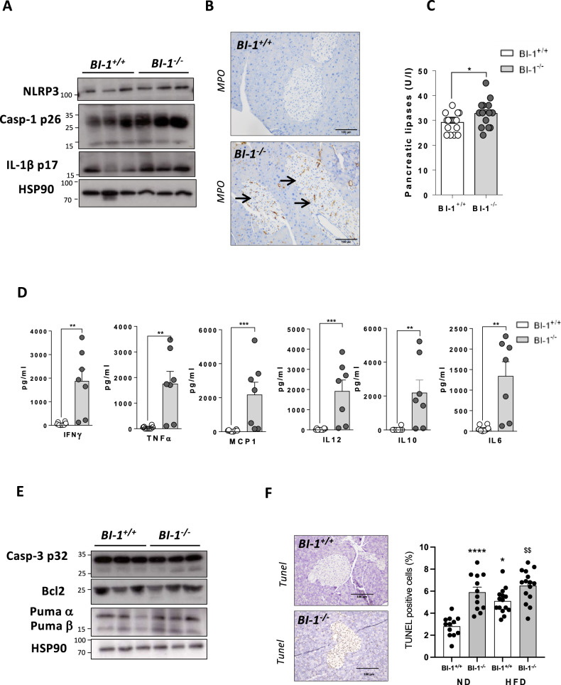 The prevalence of diabetes steadily increases worldwide mirroring the prevalence of obesity. Endoplasmic reticulum (ER) stress is activated in diabetes and contributes to β-cell dysfunction and apoptosis through the activation of a terminal unfolded protein response (UPR). Our results uncover a new role for Bax Inhibitor-One (BI-1), a negative regulator of inositol-requiring enzyme 1 (IRE1α) in preserving β-cell health against terminal UPR-induced apoptosis and pyroptosis in the context of supraphysiological loads of insulin production. BI-1-deficient mice experience a decline in endocrine pancreatic function in physiological and pathophysiological conditions, namely obesity induced by high-fat diet (HFD). We observed early-onset diabetes characterized by hyperglycemia, reduced serum insulin levels, β-cell loss, increased pancreatic lipases and pro-inflammatory cytokines, and the progression of metabolic dysfunction. Pancreatic section analysis revealed that BI-1 deletion overburdens unfolded proinsulin in the ER of β-cells, confirmed by ultrastructural signs of ER stress with overwhelmed IRE1α endoribonuclease (RNase) activity in freshly isolated islets. ER stress led to β-cell dysfunction and islet loss, due to an increase in immature proinsulin granules and defects in insulin crystallization with the presence of Rod-like granules. These results correlated with the induction of autophagy, ER phagy, and crinophagy quality control mechanisms, likely to alleviate the atypical accumulation of misfolded proinsulin in the ER. In fine, BI-1 in β-cells limited IRE1α RNase activity from triggering programmed β-cell death through apoptosis and pyroptosis (caspase-1, IL-1β) via NLRP3 inflammasome activation and metabolic dysfunction. Pharmaceutical IRE1α inhibition with STF-083010 reversed β-cell failure and normalized the metabolic phenotype. These results uncover a new protective role for BI-1 in pancreatic β-cell physiology as a stress integrator to modulate the UPR triggered by accumulating unfolded proinsulin in the ER, as well as autophagy and programmed cell death, with consequences on β-cell function and insulin secretion. In pancreatic β-cells, BI-1-/- deficiency perturbs proteostasis with proinsulin misfolding, ER stress, terminal UPR with overwhelmed IRE1α/XBP1s/CHOP activation, inflammation, β-cell programmed cell death, and diabetes.