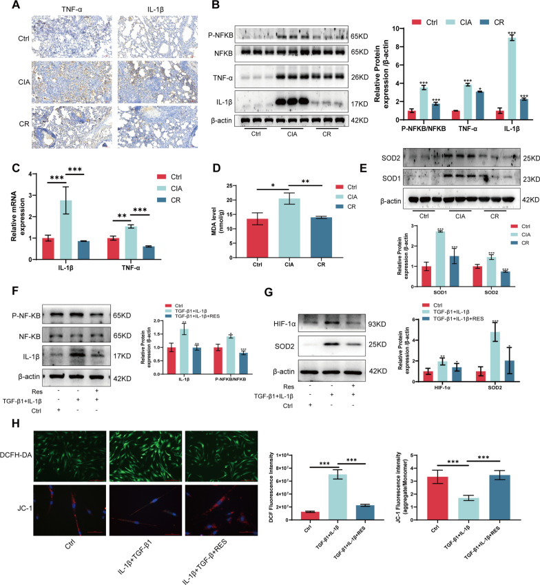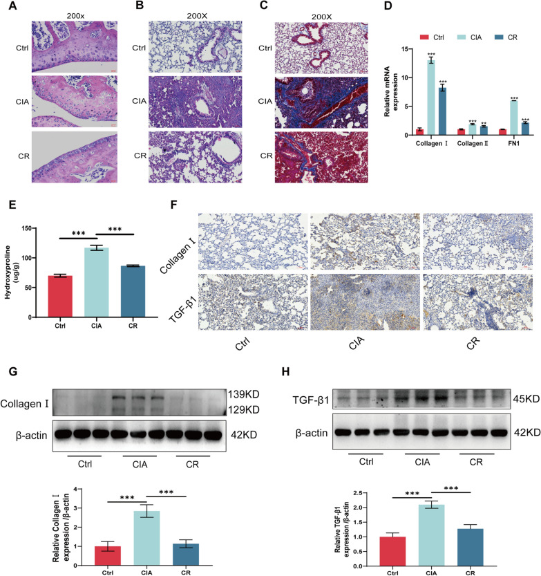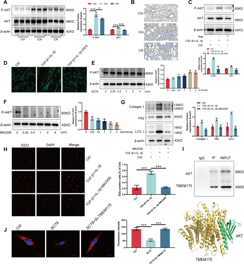 Methods: We established an arthritis model by combining chicken type II collagen and complete Freund's adjuvant. Resveratrol treatment was administered via tube feeding for 10 days. Pathological changes in both the joints and lungs were evaluated using HE and Masson staining techniques. Protein expression of TGF-β1, AKT, and TMEM175 was examined in lung tissue. MRC-5 cells were stimulated using IL-1β in combination with TGF-β1 as an in vitro model of RA-ILD, and agonists of AKT, metabolic inhibitors, and SiRNA of TMEM175 were used to explore the regulation and mechanism of action of resveratrol RA-ILD.