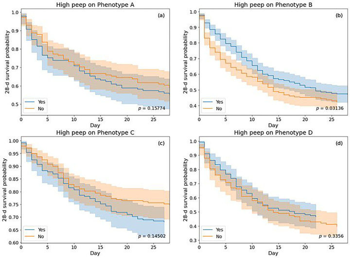 Results: Four distinct ARF phenotypes were identified: A (severe multi-organ dysfunction (MOD) with a high likelihood of kidney injury and heart failure), B (severe hypoxemic respiratory failure [median P/F=123]), C (mild hypoxia [median P/F=240]), and D (severe MOD with a high likelihood of hepatic injury, coagulopathy, and lactic acidosis). Patients in each phenotype showed differences in clinical course and mortality rates despite similarities in demographics and admission co-morbidities. The phenotypes were reproduced in external validation utilizing an external MICU from second hospital and SICUs from both centers. Kaplan-Meier analysis showed significant difference in 28-day mortality across the phenotypes (p<0.01) and consistent across both centers. The phenotypes demonstrated differences in treatment effects associated with high positive end-expiratory pressure (PEEP) strategy.