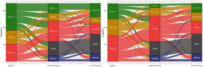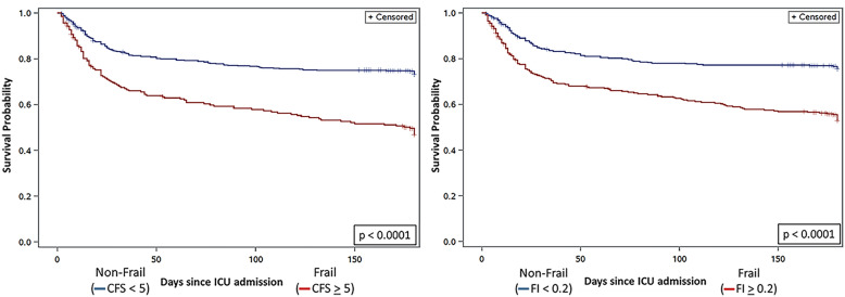 Results: In 687 patients, whose age (mean ± standard deviation) was 68.8 ± 9.2 years, frailty prevalence was higher when measured with the FI (CFS, FI %): ICU admission (29.8, 44.8), hospital discharge (54.6, 67.9), 6 months (34.1, 42.6). Compared to ICU admission, aggregate frailty severity increased to hospital discharge but improved by 6 months; individually, CFS and FI were higher in 45.3% and 50.6% patients, respectively at 6 months. Compared to hospital discharge, 18.7% (CFS) and 20% (FI) were higher at 6 months. Mortality was higher in frail patients. Processes of care and adverse events were similar except for worse ICU/ward mobility and more frequent delirium in frail patients.