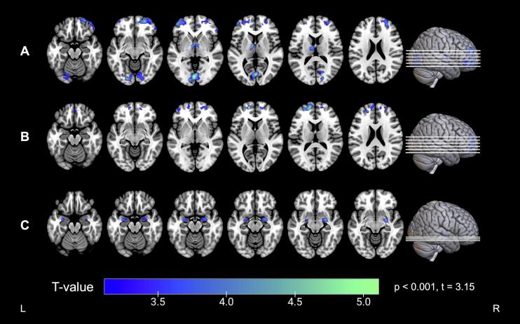 Conclusions: The SCD group showed brain atrophy mainly in the frontal and occipital lobes. However, only the SCDp group demonstrated atrophy in the medial temporal lobe at baseline. Structural damage in the brain regions was anatomically connected, which may contribute to early memory decline.