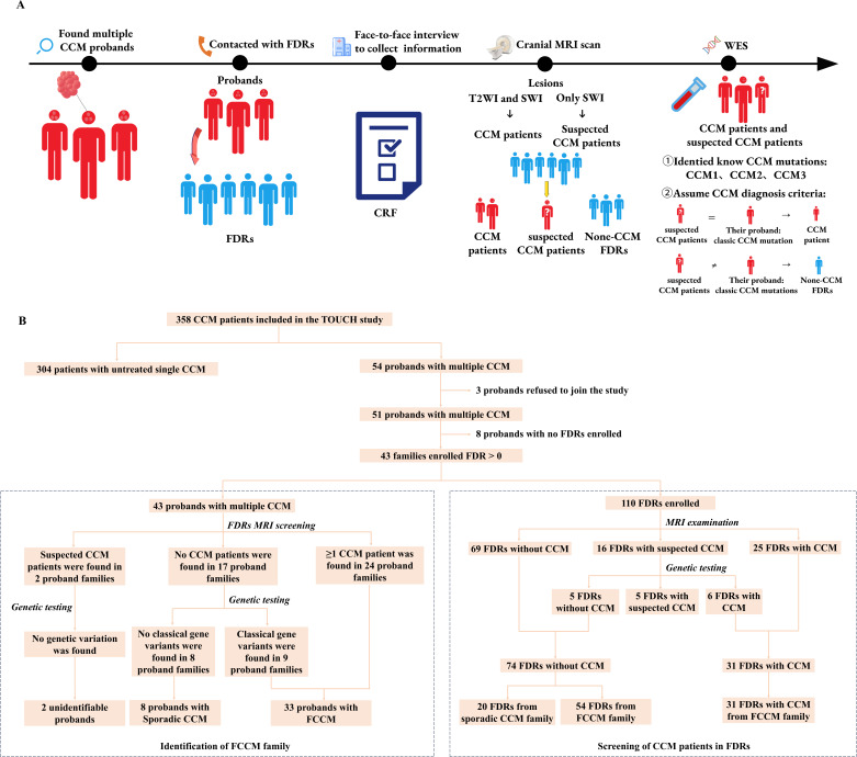 Methods: Patients with multiple CCMs who enrolled from the Treatments and Outcomes of Untreated Cerebral Cavernous Malformations in China database were considered as probands and FDRs were recruited. Cranial MRI was performed to screen the CCMs lesions, and whole-exome sequencing was performed to identify CCM mutations. MRI and genetic screening were combined to diagnose FCCM in FDRs, and the results were presented as prevalence and 95% CIs. The Kaplan-Meier (KM) method was used to calculate the cumulative incidence of FCCM.