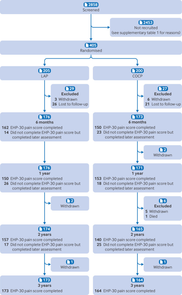 Conclusions: Postoperative prescription of a long acting progestogen or the combined oral contraceptive pill results in similar levels of improvement in endometriosis related pain at three years, with both groups showing around a 40% improvement compared with preoperative levels. While women can be reassured that both options are effective, the reduced risk of repeat surgery for endometriosis and hysterectomy might make long acting reversible progestogens preferable for some.