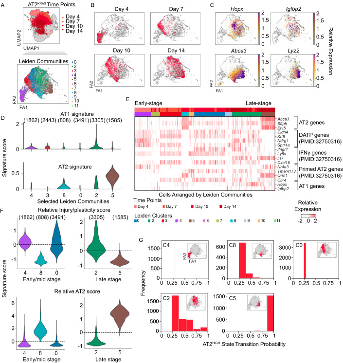 Glycine-12 mutations in the GTPase KRAS (KRASG12) are an initiating event for development of lung adenocarcinoma (LUAD). KRASG12 mutations promote cell-intrinsic rewiring of alveolar type-II progenitor (AT2) cells, but to what extent such changes interplay with lung homeostasis and cell fate pathways is unclear. Here, we generated single-cell RNA-seq (scRNA-seq) profiles from AT2-mesenchyme organoid co-cultures, mice, and stage-IA LUAD patients, identifying conserved regulators of AT2 transcriptional dynamics and defining the impact of KRASG12D mutation with temporal resolution. In AT2WT organoids, we found a transient injury/plasticity state preceding AT2 self-renewal and AT1 differentiation. Early-stage AT2KRAS cells exhibited perturbed gene expression dynamics, most notably retention of the injury/plasticity state. The injury state in AT2KRAS cells of patients, mice, and organoids was distinguishable from AT2WT states via altered receptor expression, including co-expression of ITGA3 and SRC. The combination of clinically relevant KRASG12D and SRC inhibitors impaired AT2KRAS organoid growth. Together, our data show that an injury/plasticity state essential for lung repair is co-opted during AT2 self-renewal and LUAD initiation, suggesting that early-stage LUAD may be susceptible to interventions that target specifically the oncogenic nature of this cell state.